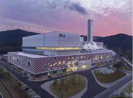 寧波市鄞州區(qū)生活垃圾焚燒發(fā)電廠坐落于青山綠水之間,深紅色...